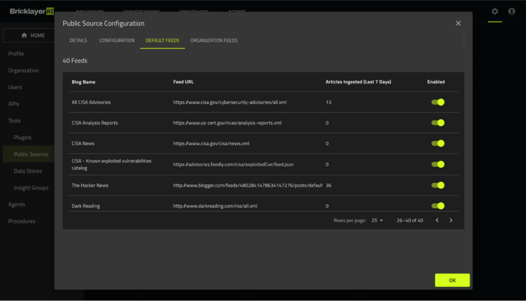 Bricklayer AI provides a preconfigured set of feeds, including public knowledge sources such as CISA, Hacker News, and Dark Reading. Each can be enabled or disabled individually. Teams can also customize by adding additional URL-based feeds through a simple interface.