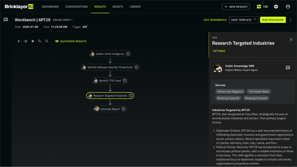 Example: A Bricklayer AI Threat Intelligence Analyst agent produces an executive report on APT29 based on the various sources of data collected and analyzed by Public Knowledge Agents.